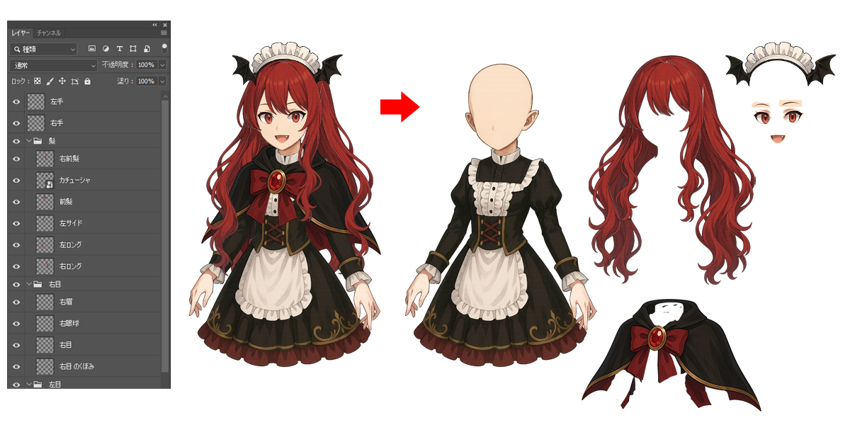 さえ動けばアバターっぽくなると思いますが、今回はもう少しがんばって、髪とカチューシャの羽根を動かすように分解しました。