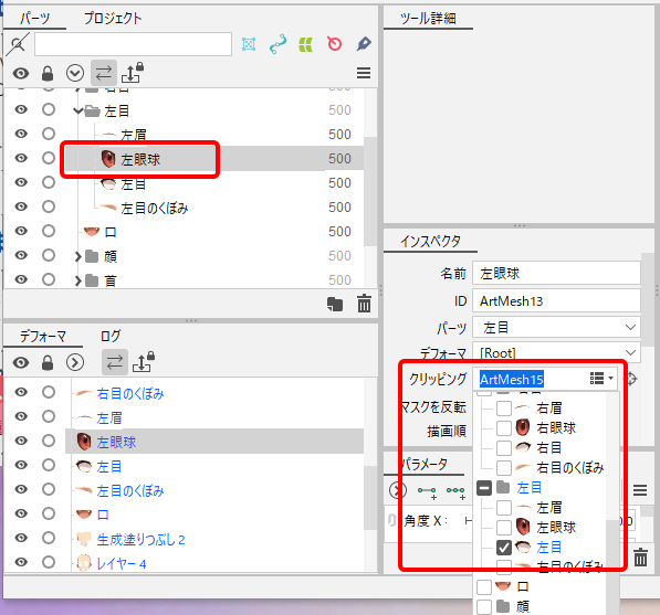 瞳(眼球)を選択し、クリッピングで白目部分のレイヤー(ここでは「左目」)にチェックを入れます。
