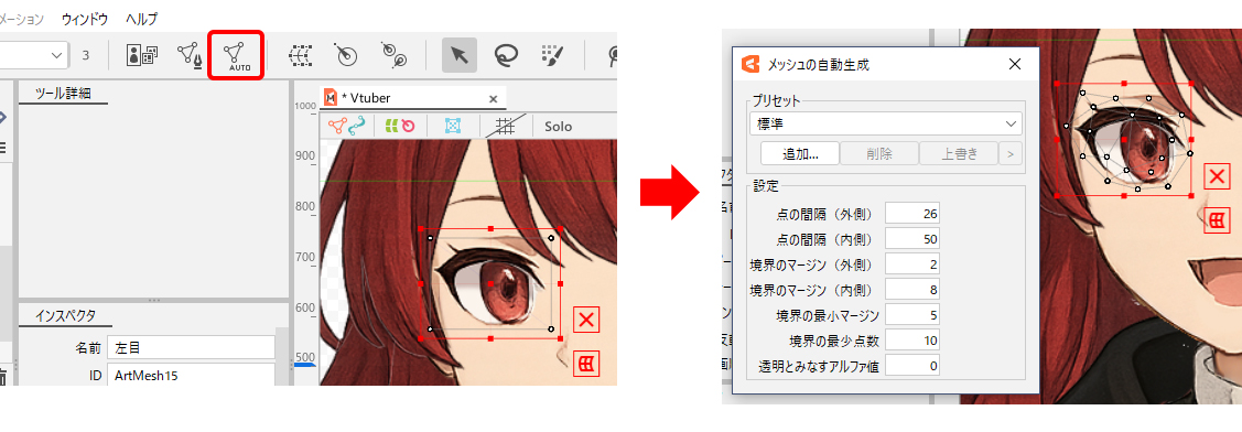 目を囲っているオブジェクト(ここでは「左目」という名前)を選択し、メッシュの自動生成アイコンをクリックします。