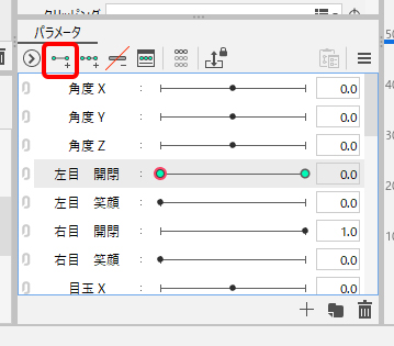 パラメータタブで「左目 開閉」を選択し、「キーの2点追加」をクリックします。