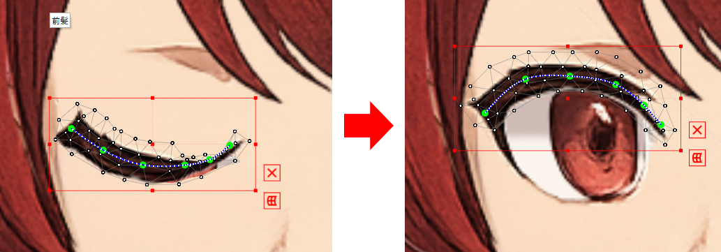 これで赤丸が左にあるとき(閉じているときにあたる)に瞳を閉じた形状にすれば、目の開閉アニメーションが実装できます。