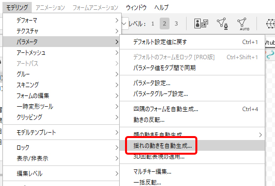 次にメニューからモデリング→パラメータ→揺れの動きを自動生成を選択します。