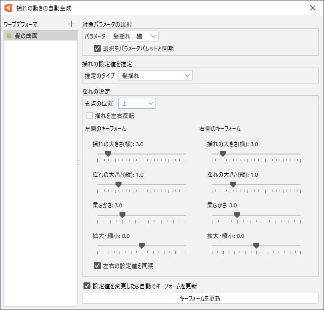 髪やアクセサリーなどの揺れについては、自動生成機能がありますのでそれを使ってみます。