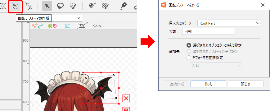 カチューシャの蝙蝠の羽を動かせるようにします。