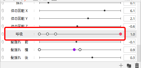 簡単に回転デフォーマを設置し、呼吸のモーションに合わせて短い動きをするようにしました。