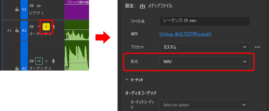 ナレーション用のトラックをソロにし、出力の形式で音声ファイル(WAVが無難)を選んで書き出しを行います。