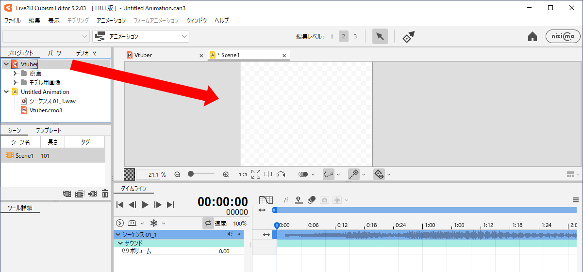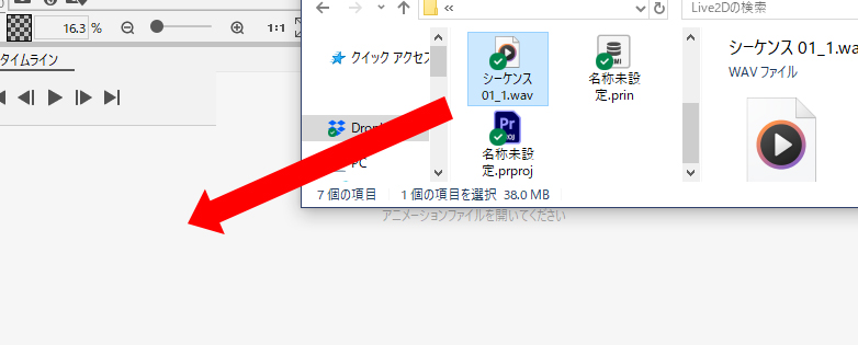 Live2Dのタイムラインタブに先程作成した音声ファイルをドラッグします。