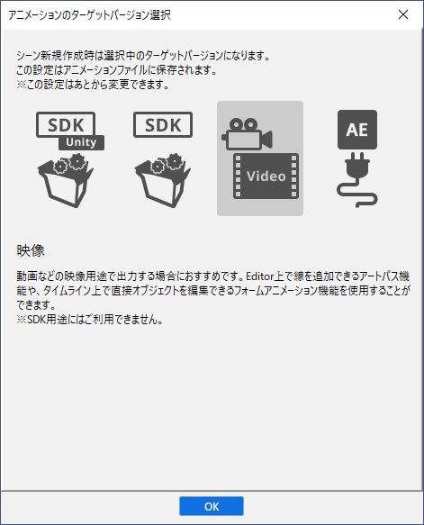 「アニメーションのターゲットバージョンの選択」というウインドウが表示されます。