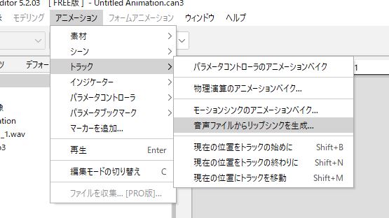ステージにキャラクターが表示された状態で、メニューの「アニメーション」→「トラック」→「音声ファイルからリップシンクを生成」を選択します。