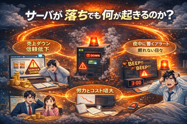 サーバ停止の影響は、ユーザーだけでなく運用担当者にも及びます。突然のアラート、夜中の呼び出し、原因調査と復旧作業。状況によっては長時間にわたる対応が必要となり、精神的・肉体的な負担は非常に大きなものになります。