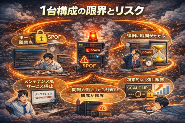 サーバを1台で運用している場合、そのサーバはシステム全体の「単一障害点(Single Point of Failure)」となります。つまり、その1台が停止した瞬間に、すべてのサービスが同時に停止してしまうという構造です。