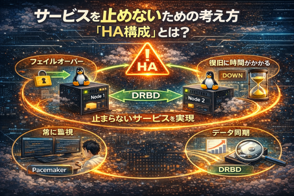 本記事では、ディスクをリアルタイムで同期する「DRBD」を中心に、PacemakerやCorosyncといったコンポーネントを組み合わせたHAクラスターの基本的な仕組みを、初心者にもわかりやすく解説します。まずは全体像を理解し、「なぜ止まらないサーバが実現できるのか」を一緒に見ていきましょう。