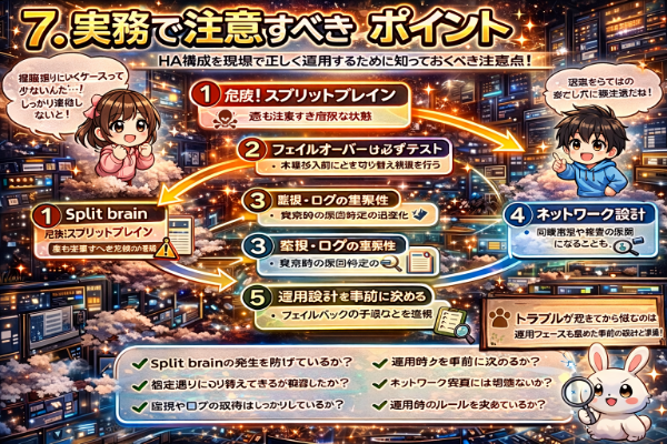HA構成は「組めば安心」というものではなく、「正しく設計し、検証し、運用する」ことで初めて効果を発揮します。ここでは、実務で特に注意すべきポイントをいくつか紹介します。