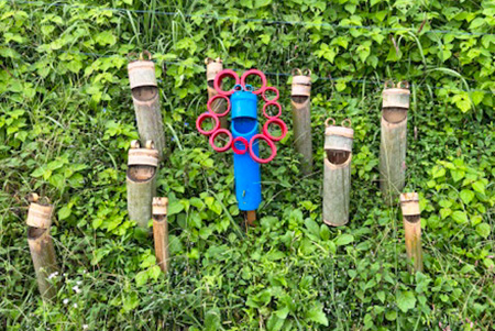 竹でできたミャクミャク様。赤い◯と青の竹だけで、ミャクミャクってわかる、シンプルな可愛らしさ。