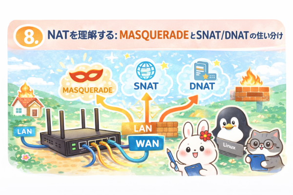 とはいえ、一般的な企業ネットワークやクラウド環境では、まずMASQUERADEで問題ありません。「まず動かす」には最適な方式です。