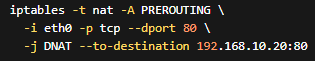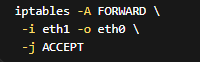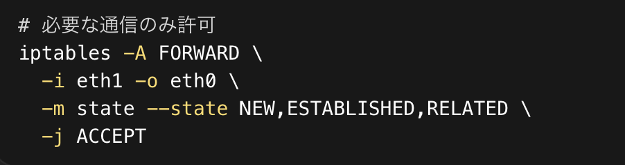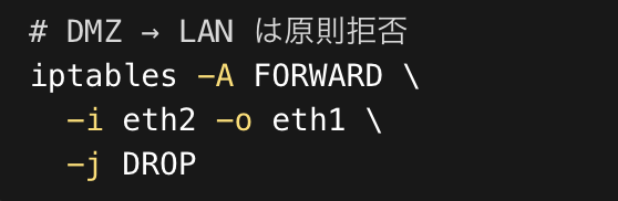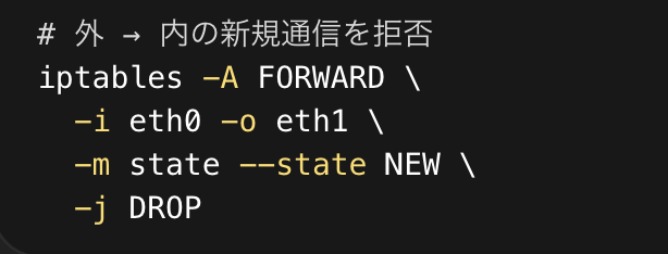 企業向けの構成では、FORWARDチェーンは実質的にFirewallの中核です。どのネットワークから、どのネットワークへ、どのプロトコルを通すのか。そのルールを明示的に定義することで、意図しない通信を確実に遮断できます。