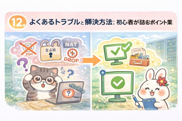 iptables運用で初心者がつまずきやすい代表的なトラブルを取り上げ、それぞれの原因と対処方法を解説します。SSH接続ができなくなった場合の確認ポイント、通信が通らないときの調査方法、NAT設定のよくある落とし穴など、実務でも頻繁に遭遇するケースを中心に整理します。