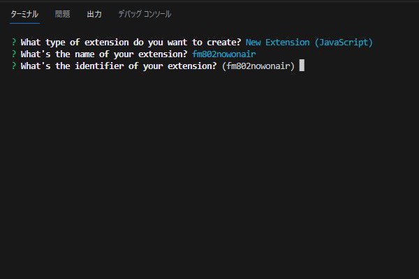 Yeoman Generatorがインストールできたら以下のコマンドでVSCode拡張機能のテンプレートを作成できます。