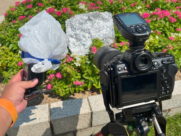 フラッシュを使うとどうしても光が硬くなりがちですが、家庭にあるもので十分工夫できます。僕がよくやるのは、コンビニのビニール袋やトレーシングペーパーをフラッシュの前に被せてディフューザー代わりにする方法です。光が拡散されて影が柔らかくなり、被写体が自然に浮かび上がります。また、背景にアルミホイルをクシャッとさせたものを置くと、光が反射してキラキラした玉ボケが生まれ、花の写真が一気に華やかになります。