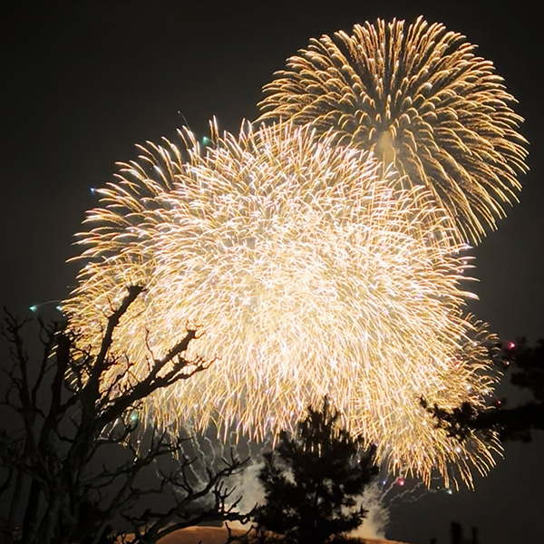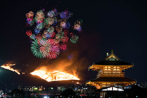 こちらは、画像素材サイトからダウンロードしたものですが、花火と山焼きがセットになった写真をよく見かけます。