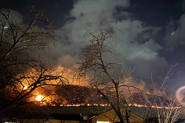 花火にはベスポジでしたが、山焼きを見るには、手前の木々と斜面が邪魔で見えにくい。