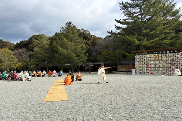清めの神事「蟇目(ひきめ)の儀」の矢が放たれた後は、男女8人ずつに分かれ、続けて弓矢が放たれます。