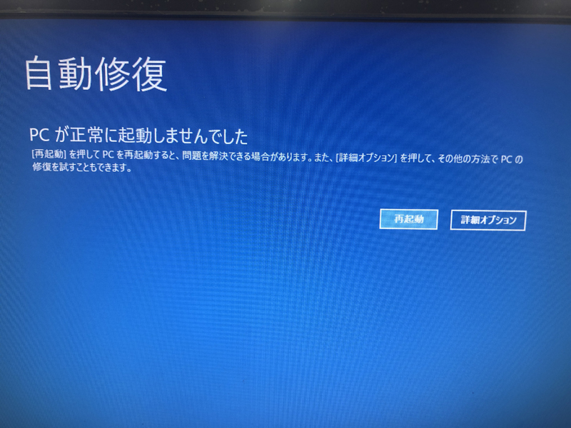 自動修復の画面が表示されたら【詳細オプション】のボタンを押します。