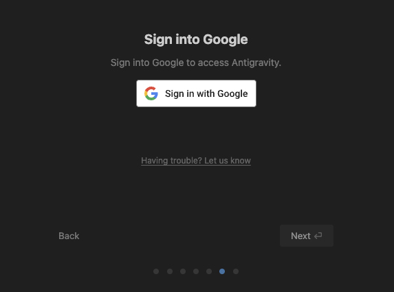 Google製のエディタなので当たり前といえばそうですが、Antigravityの使用にGoogleログインは必須です。