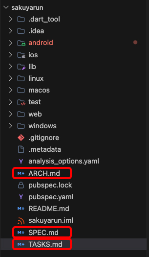 README.md(概要)、SPEC.md(仕様)、ARCH.md(設計)、TASKS.md(工程)のファイルを用意しました。