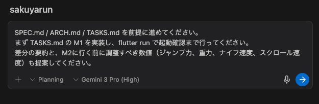 特に、SPEC.md・ARCH.md・TASKS.mdのようなドキュメントを用意して開発を進めるドキュメント主導型の開発スタイルとの相性が良く、設計から実装までの橋渡しをAntigravityに任せることができます。